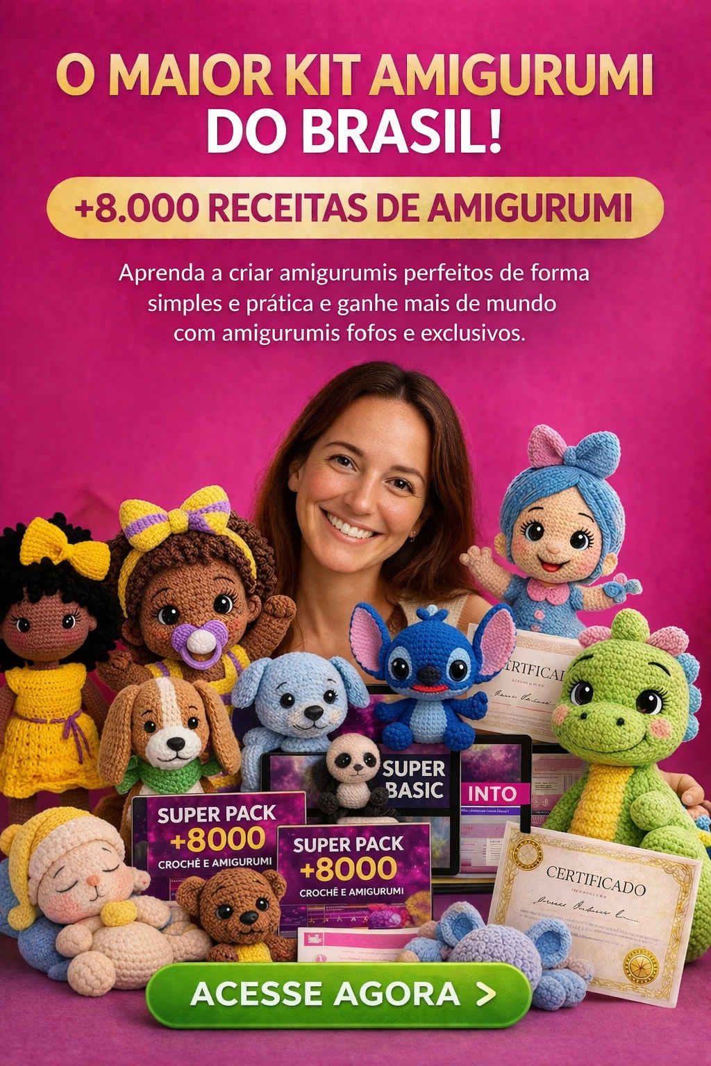 Você terá acesso a um curso completo e mais de 8.000 mil Receitas de Amigurumi e mais vídeos aulas passo a passo juntos com todos os bônus citados a cima…