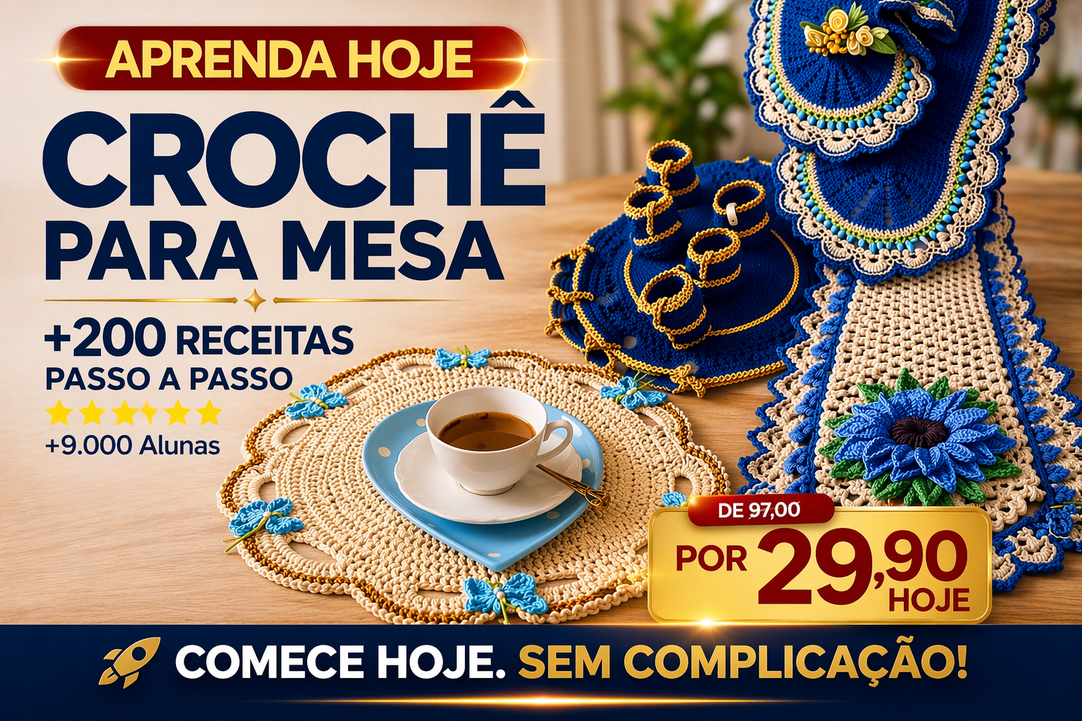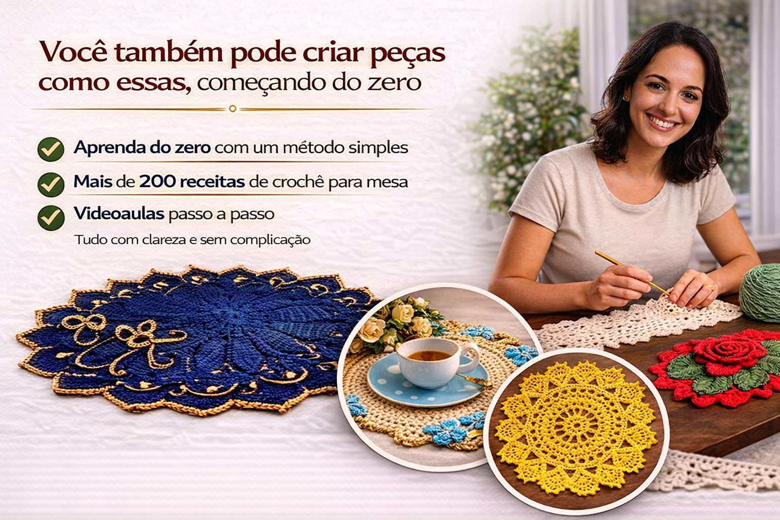 Transforme fios em verdadeiras obras de arte para sua mesa — aprenda do zero ao avançado a criar caminhos de Mesa, souplats e jogos americanos irresistíveis, com vídeo aulas claras, passo a passo, e técnicas que tornam o crochê fácil, prazeroso e altamente lucrativo.